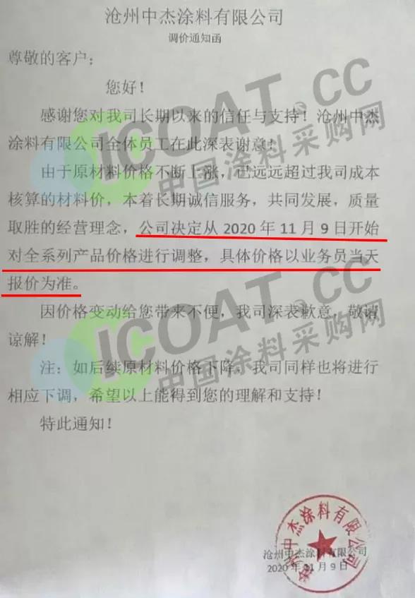 11月9日,滄州中杰涂料發函,稱11月9日起,對全系列產品價格進行調整,具體價格以業務員當天報價為準。