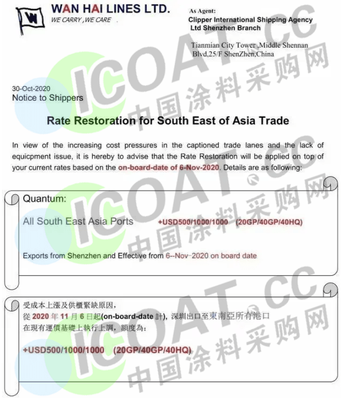 跨境物流成本也在猛增,出口海運(yùn)費(fèi)水漲船高。上海至美國西岸基本港的集裝箱運(yùn)費(fèi)已經(jīng)達(dá)到8年來的最高水平,我們正在經(jīng)歷著,南美4000,美東5000的高昂價(jià)格,如今美線的高昂運(yùn)價(jià)還沒降下來,東南亞就緊跟著來了……一船公司宣布2020年11月6日起深圳出口至東南亞所有港口價(jià)格上調(diào)!+USD500/1000/1000。