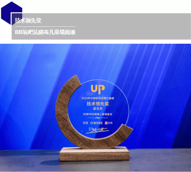 此次“時代追光者”2020年度家居品牌力量評選中,嘉寶莉憑借BB氧吧抗病毒兒童墻面漆摘下技術領先獎,正體現了業界和市場對嘉寶莉卓越產品力的認可。