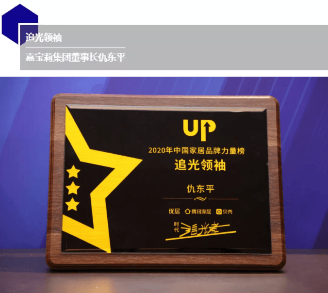 在此次峰會上,“時代追光者”2020年度家居品牌力量評選結果同步揭曉。嘉寶莉憑借出色的品牌力和產品力,斬獲技術領先獎和年度IP營銷大獎;嘉寶莉董事長仇東平女士榮獲2020年中國家居品牌“追光領袖”榮譽稱號。