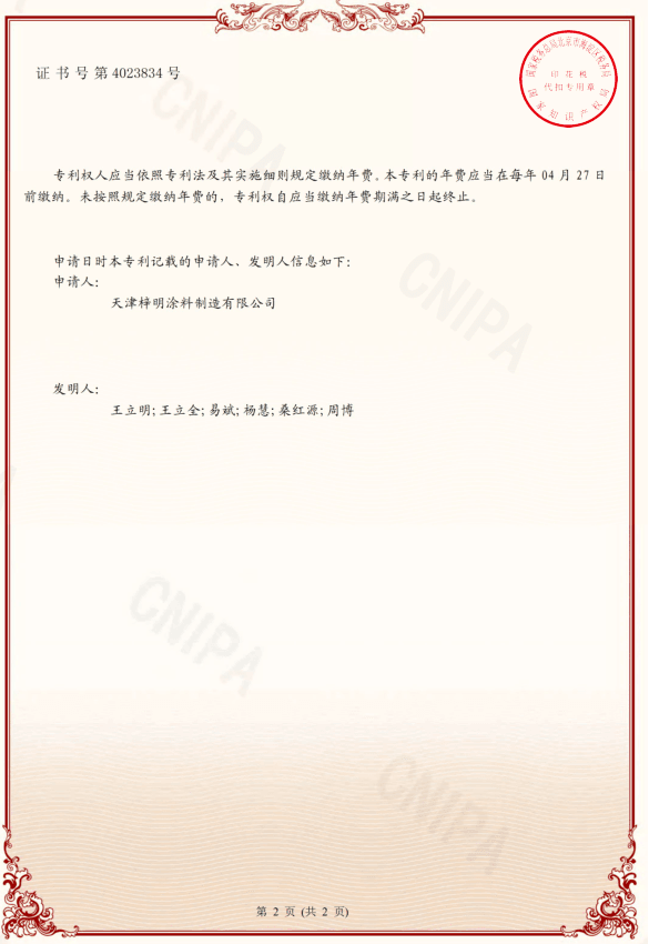 紫明水性快干實色涂料系列產品由于設計理念先進,即保證了產品的性能和外觀要求有達到了低成本的效果,在市場競爭中優勢明顯,會有很好的市場前景。該系列產品通過市場應用反應良好,顏色豐富實用性強,同時申請國家發明專利并得到授權,專利號為:ZL201810389913.5。