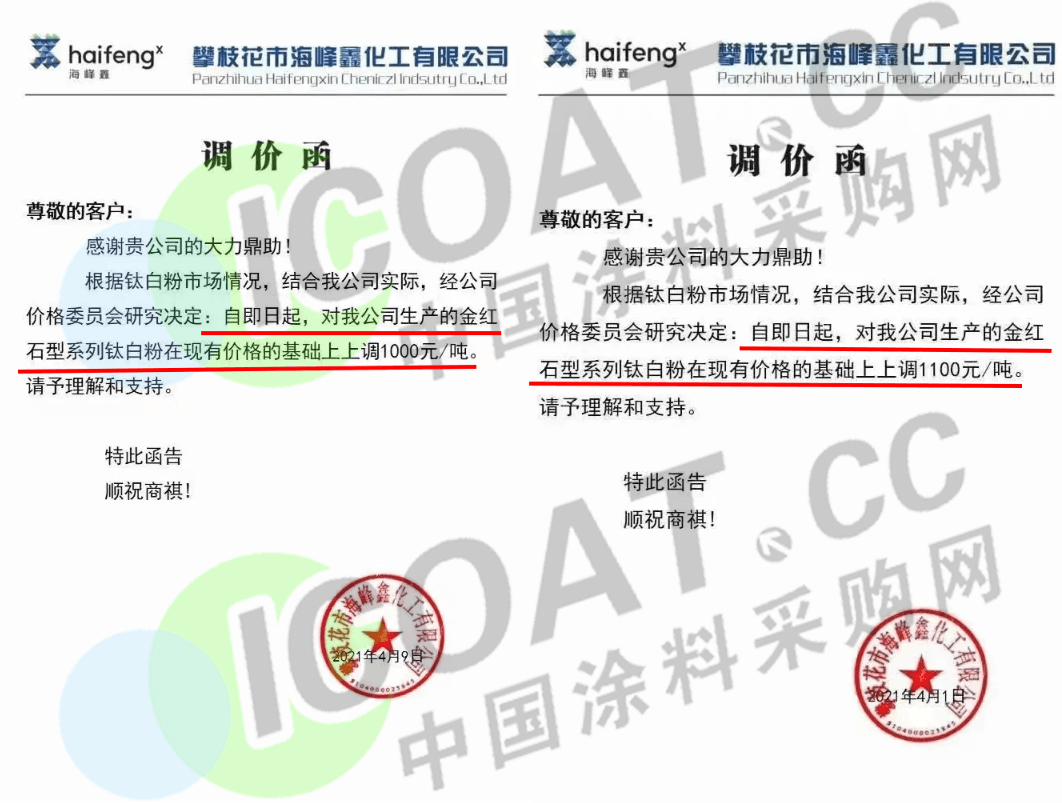 9日,攀枝花市海峰鑫化工發函,宣布金紅石型系列鈦白粉價格上調1000元/噸。而在本月1日,海峰鑫化工曾發函,宣布金紅石型系列鈦白粉上漲1100元/噸。不到10天的時間,海峰鑫化工兩連漲,累計調漲2100元/噸,年內累計調漲3900元/噸。