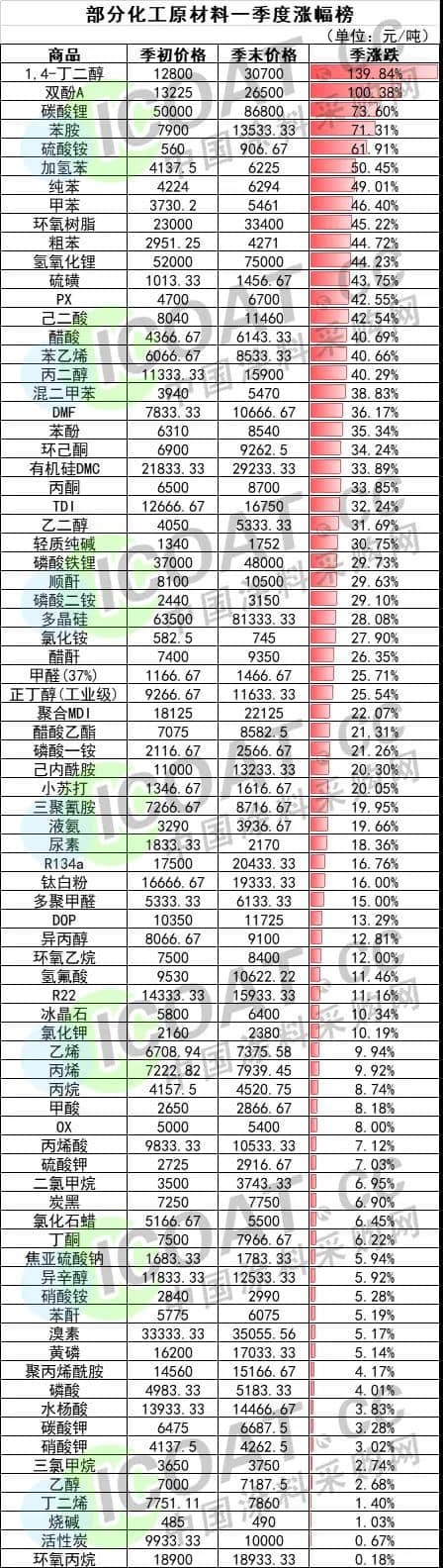 與此同時,樹脂、雙酚A等多種化工原材料也沒有停下漲價的腳步。據涂料采購網不完全統計,2021年一季度近百種原材料價格上調,其中丁二醇上漲139.84%,雙酚A上漲100.38%,碳酸鋰上漲73.60%。