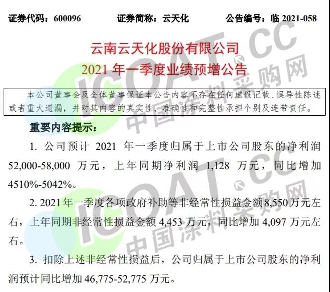 據涂料采購網不完全統計,目前公布2021年一季度報告或業績快報的化工行業上市公司中,有十幾家化企業績同比有所增長或預增,部分企業凈利潤預增幾十倍,多氟多凈利潤預增超過7100%,可以說在2021年實現了“開門紅”。