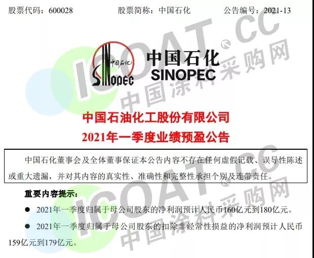 中國石化一季度歸屬于母公司股東的凈利潤預計人民幣160億元到180億元,較2020年同期預計將實現扭虧為盈,較2019年同期預計將增加8.1%到21.6%;歸屬于母公司股東的扣除非經常性損益的凈利潤預計人民幣159億元到179億元,較2020年同期預計將實現扭虧為盈,較2019年同期預計將增加10.4%到24.3%。