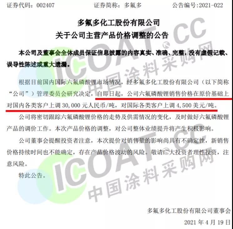 多氟多是氟化鹽生產(chǎn)制造的全球龍頭企業(yè),也是國(guó)內(nèi)首家實(shí)現(xiàn)鋰離子電池核心材料六氟磷酸鋰進(jìn)口替代的企業(yè)。此前其曾預(yù)計(jì)2021年第一季度將實(shí)現(xiàn)歸屬于上市公司股東的凈利潤(rùn)在9000萬(wàn)元~9500萬(wàn)元之間,同比增長(zhǎng)7183.91%-7588.57%,原因是下游鋰電池需求旺盛,六氟磷酸鋰作為動(dòng)力鋰電池電解液的核心材料,其價(jià)格提升明顯。據(jù)涂料采購(gòu)網(wǎng)了解,隨著新能源汽車(chē)產(chǎn)銷(xiāo)量的高速增長(zhǎng),上游鋰電池產(chǎn)業(yè)鏈成了“香餑餑”,去年開(kāi)始,國(guó)內(nèi)鋰電池出貨量增長(zhǎng),而國(guó)內(nèi)鋰電池行業(yè)所需的化工原材料也得到了較大的拉動(dòng),價(jià)格直線(xiàn)拉升。