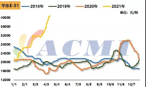 醋酸:目前華東地區(qū)醋酸報(bào)價(jià)7000元/噸上方,較年初上漲2700元/噸,漲幅62.79%。最主要的原因還是在于供需面的不平衡。醋酸下游新增主要集中在PTA行業(yè),累計(jì)新增產(chǎn)能870萬(wàn)噸/年,相當(dāng)于理論上每年增加了約50萬(wàn)噸的醋酸需求。而供應(yīng)方面來(lái)看,2020年國(guó)內(nèi)醋酸產(chǎn)能只有陜西延長(zhǎng)擴(kuò)產(chǎn)10萬(wàn)噸/年,因此其供應(yīng)支撐作用微乎其微。