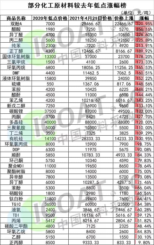化工行業價格“翻多倍”,較去年低點上漲逾300%
