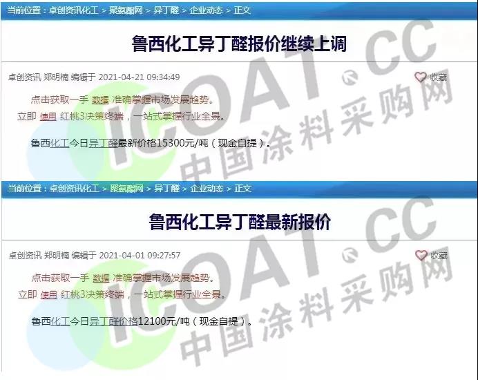 異丁醛:21日,異丁醛報價15350元/噸,較2020年低點價格上調10650元/噸,漲幅226.60%。魯西化工異丁醛月內上漲3200元/噸。異丁醛自3月底止跌反彈后,漲幅逐漸放大,截至20日,異丁醛收盤14800元/噸,不斷刷新歷史高位。下游新戊二醇全年開工率平均在80%左右,異丁醛產能缺口已經在10萬噸以上。
