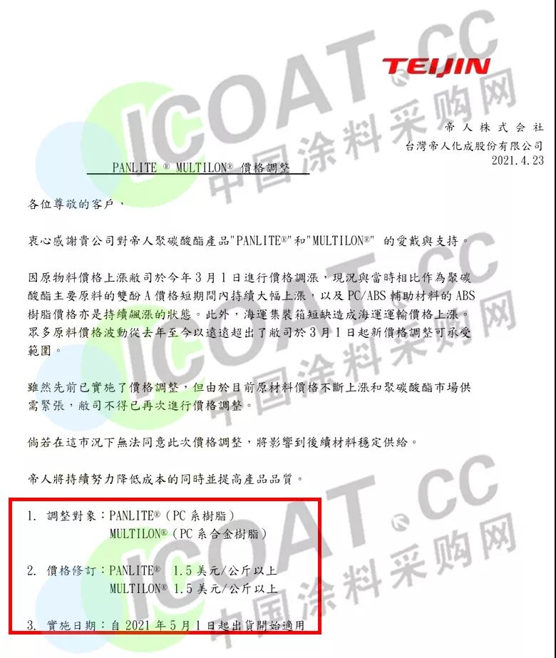 近日帝人株式會社宣布,由于雙酚A成本暴漲,PC/ABS和ABS樹脂等部分輔料的價格持續飆漲疊加海運成本不斷上漲,不得不對PC的價格進行上調,漲價于5月1日起生效:
