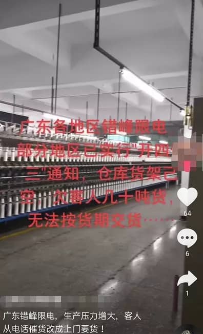 東莞某企業(yè)表示,限電之后只能開一臺機器把急單趕一趕,很多單現(xiàn)在連排期都排不上。部分企業(yè)已經(jīng)上演了“空城計”,工作日廠區(qū)卻無人開工,工作最忙碌的反而是巡視的保安。工廠只留著打包部門在工廠院子里打包出貨,生產(chǎn)部門都沒有上班。盡管原料已經(jīng)備齊,但是無法開機,欠客戶的幾十噸貨無法按期交付,老板和員工都只能干瞪眼。企業(yè)已經(jīng)由智能化生產(chǎn)“返璞歸真”到人工化時代,貨梯無法正常使用,員工就用扁擔挑著100多箱貨品下樓梯。