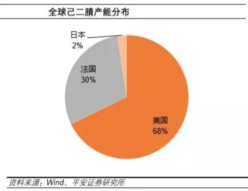 己二腈的生產工藝較長,催化劑體系復雜,反應物中還含有劇毒的氰化物,技術壁壘非常高。目前全球的己二腈產能集中在美國、法國和日本,己二腈的供應者僅有英威達、奧升德、索爾維、旭化成四家公司14套生產裝置,全球總產能約200萬噸。其中,英威達的產能占四家公司總產能的60%。
