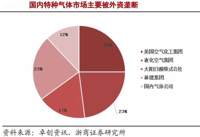 目前我國的工業氣體市場主要被幾家跨國公司所占據,德國林德、法國液化空氣、美國空氣化工產品在我國的市場份額接近50%。