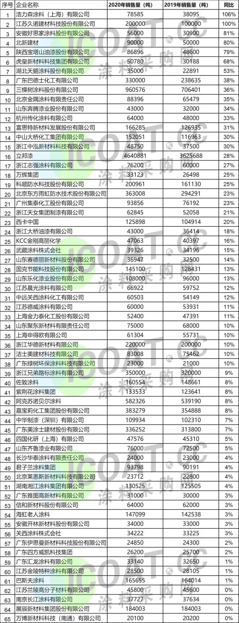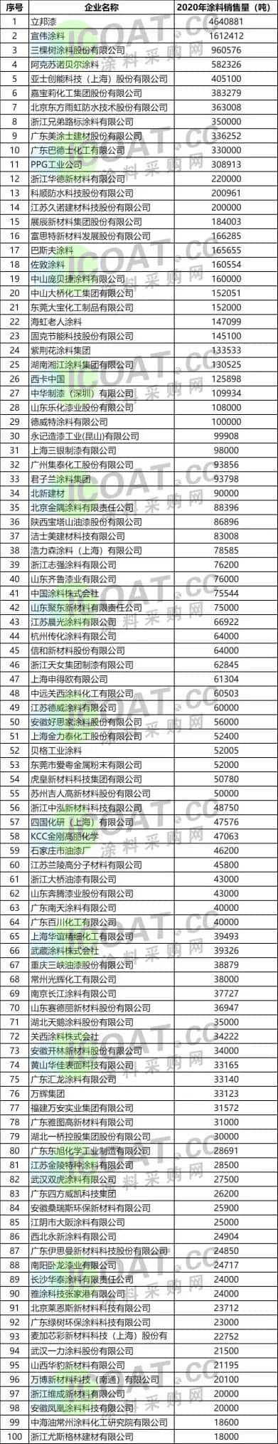 據涂料采購網不完全統計,2020年中國涂料銷售量前100家企業的總銷量為1632萬噸,較2019年涂料銷售量100強企業的總銷量增長11.8%。在疫情的重大影響之下,涂料百強企業能夠做到逆勢增長,實屬不易,這與國內新基建項目拉動有很大的關系。