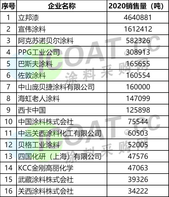據涂料采購網了解,2020年涂料百強企業當中,外資企業占比達到16%,其總銷量為8259975噸,占2020年涂料百強企業銷售量的50.6%,較2019年涂料百強外資企業總銷量增長8%。