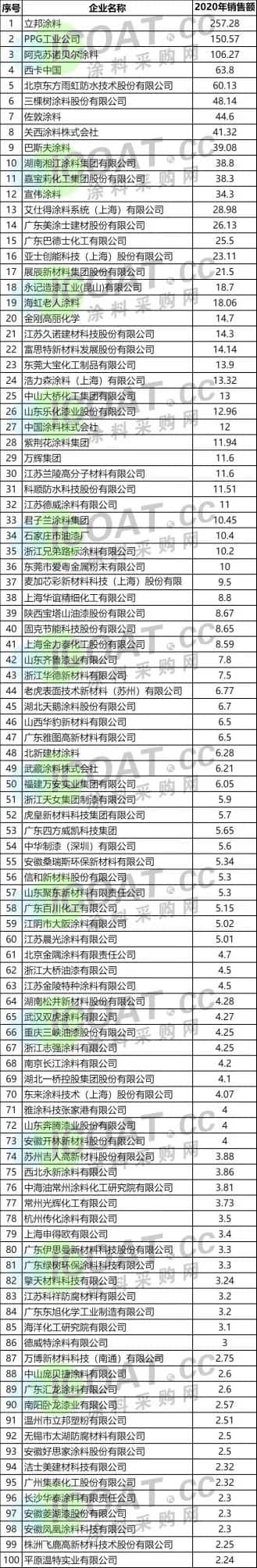據涂料采購網信息中心數據顯示,2020年涂料百強企業的總銷額達到1583億,同比2019年涂料百強銷售額增長9%。其中前三強分別是立邦、PPG、阿克蘇諾貝爾。因此,結合銷售量和銷售額的數據表對比情況來看,民族涂料企業的產品附價值并不是很高,大部分企業仍在中低端市場游走。
