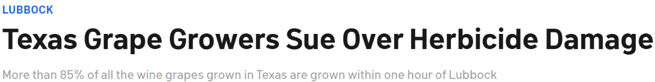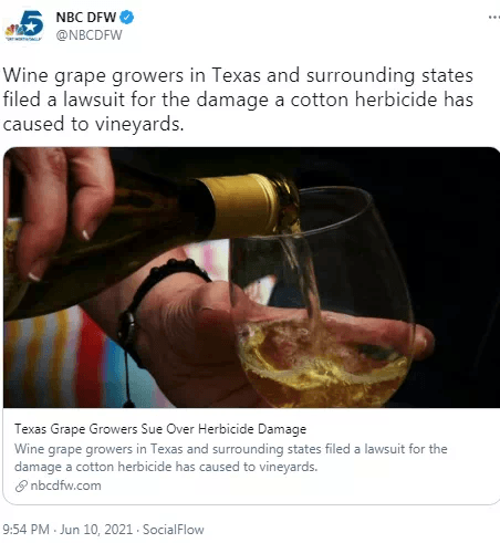 據媒體報道,德州和周邊州的葡萄種植者對制藥商拜耳-孟山都(Bayer-Monsanto)和化學巨頭巴斯夫(BASF)提起訴訟,指控他們的棉花除草劑對葡萄園造成了傷害。