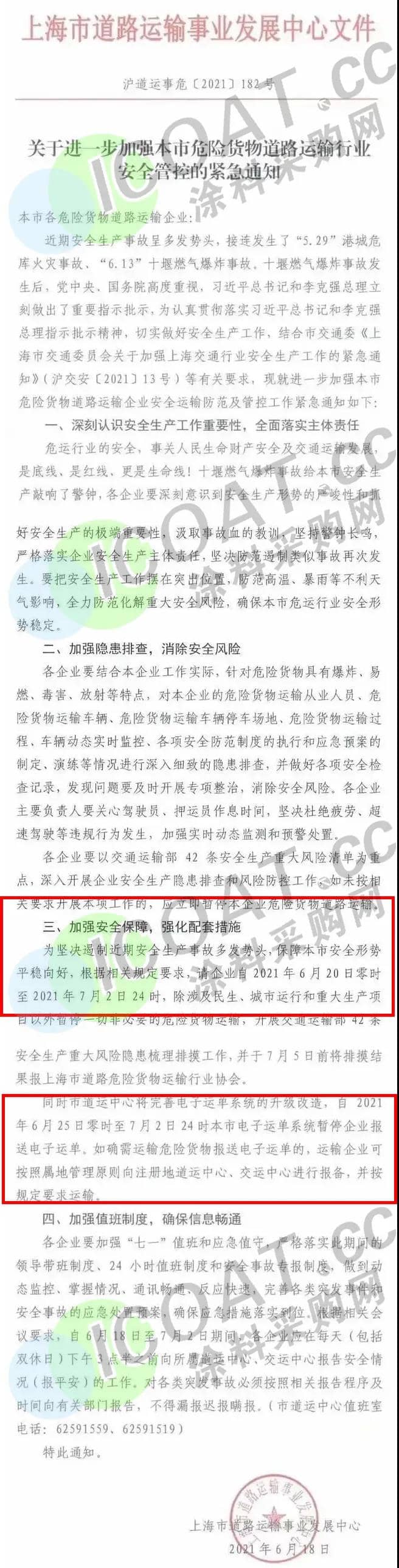 上海市道路運輸事業發展中心發布《關于進一步加強本市危險貨物道路運輸行業安全管控的緊急通知》表示,自2021年6月20日零時至2021年7月2日23時,除涉及民生、城市運行和重大生產項目以外暫停一切非必要的危險貨物運輸,開展交通運輸部42條安全生產重大風險隱患梳理摸排工作,并于7月5日前將摸排結果報上海市道路危險貨物運輸行業協會。