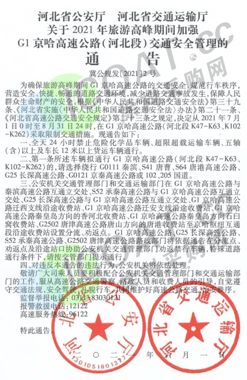 河北省公安廳、河北省交通運輸廳發布通告,稱2021年7月1日0時至8月31日24時在G1京哈高速公路(河北段K47-K63、K102-K262)采取限制交通措施,要求全天24小時禁止危險化學品車輛、超限超載運輸車輛、五軸(含)以上及車長12米以上貨運車輛通行。