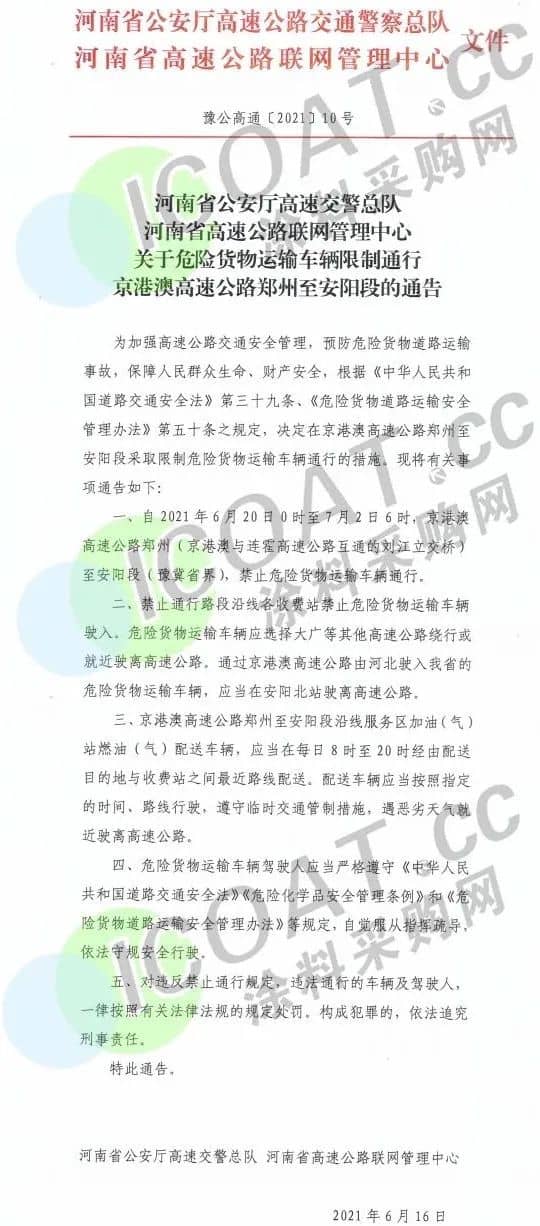 河南省公安廳高速交警總隊、河南省高速公路聯網管理中心發布關于危險貨物運輸車輛限制通行京港澳高速公路鄭州至安陽段的通告。自2021年6月20日0時至7月2日6時,京港澳高速公路鄭州(京港澳與連霍高速公路互通的劉江立交橋)至安陽段(豫冀省界),禁止危險貨物運輸車輛通行。禁止通行路段沿線各收費站禁止危險貨物運輸車輛駛入。