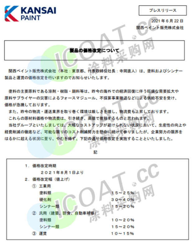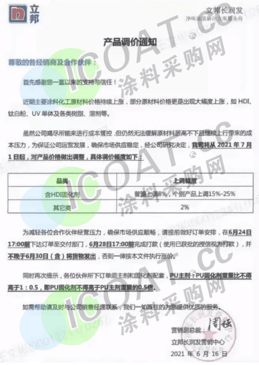 立邦長潤發涂料:自2021年7月1日起,含HDI固化劑產品價格普遍上調8%,個別產品上調15%~25%,其它類產品上漲2%。
