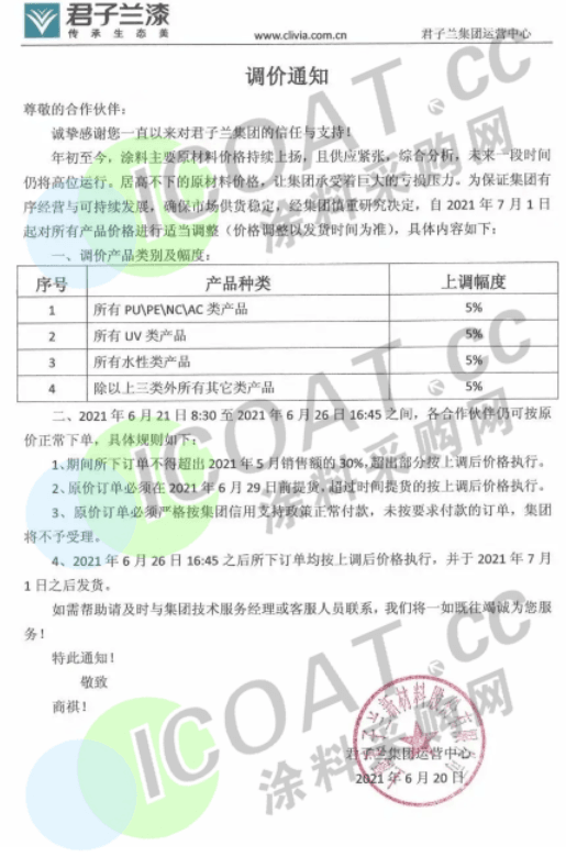 君子蘭漆發布調價通知稱,自2021年7月1日起對所有產品價格進行適當調整(價格調整以發貨時間為準),所有 PU\PE\NC\AC 類產品上調5%;所有 UV 類產品上調5%;所有水性類產品上調5%;除以上三類外所有其它類產品上調5%。此外,君子蘭表示,2021年6月21日8:30至2021年6月26日16:45 之間,各合作伙伴仍可按原價正常下單,具體規則為,下訂單不得超出2021年5月銷售額的 30%,超出部分按上調后價格執行。原價訂單必須在2021年6月29日前提貨,超過時間提貨的按上調后價格執行。原價訂單必須嚴格按集團信用支持政策正常付款,未按要求付款的訂單,集團將不予受理。2021年6月26日16:45之后所下訂單均按上調后價格執行,并于2021年7月1日之后發貨。