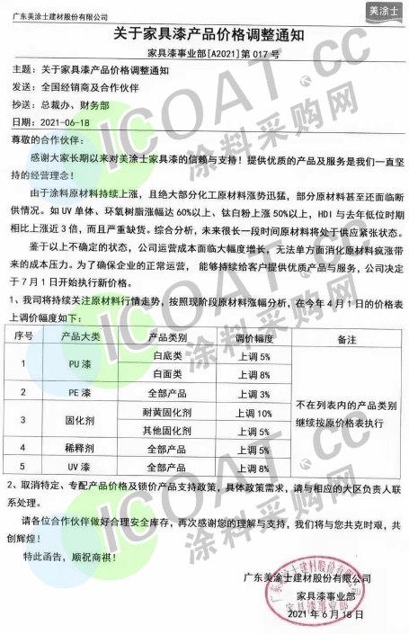 廣東美涂士建材股份有限公司家具漆事業部:決定于7月1日開始執行新價格,在今年4月1日的價格表上調價幅度為:PU漆白底類上調 5%,白面類上調8%;PE漆全部產品上調3%;耐黃固化劑上調10%,其他固化劑上調5%;稀釋劑全部產品上調5%;UV漆全部產品上調8%;不在列表內的產品類別繼續按原價格表執行。此外將取消特定、專配產品價格及鎖價產品支持政策,具體政策需求,請與相應的大區負責人聯系處理。