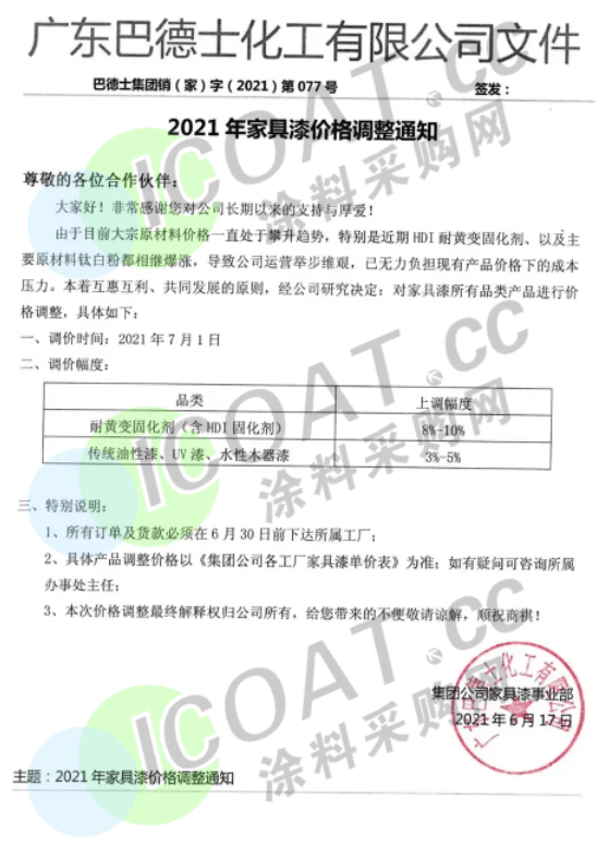 廣東巴德士化工有限公司:經研究決定,對家具漆所有品類產品進行價格調整,調價時間為2021年7月1日。調價幅度為,耐黃變固化劑(含HDI周化劑)上調 8%-10%;傳統油性漆、UV漆、水性木器漆上調3%-5%。