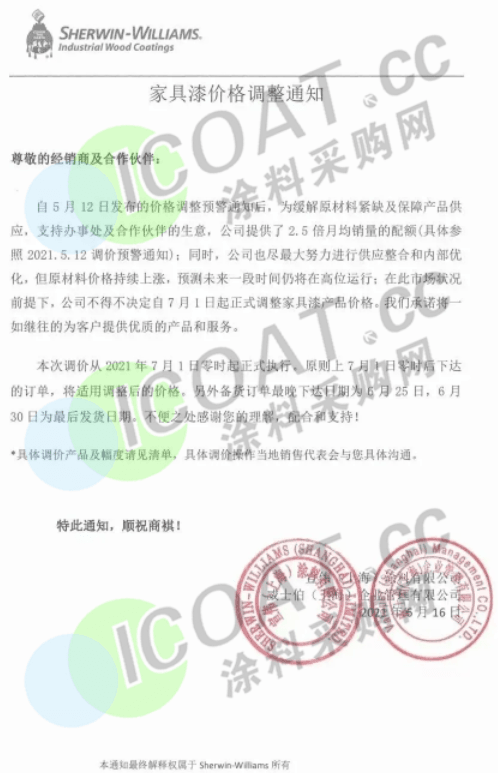 宣偉威士伯:原材料價格持續上漲,預測未來一段時間仍將在高位運行,決定自7月1日起正式調整家具漆產品價格。原則上7月1日零時后下達的訂單,將適用調整后的價格。