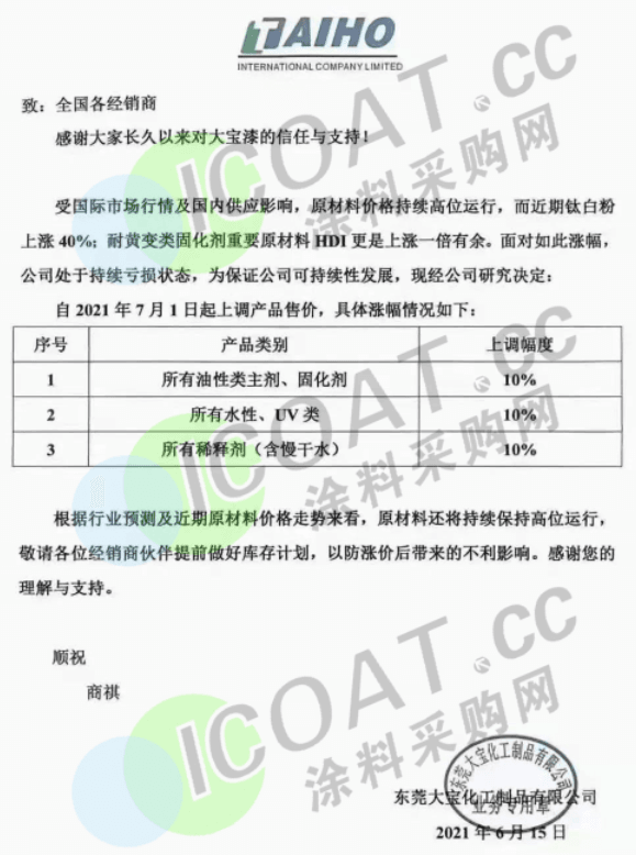 大寶漆:經研究決定,自2021年7月1日起上調產品售價。所有油性類助劑、固化劑價格上漲10%,所有水性、UV類涂料價格上漲10%,所有稀釋劑價格上漲10%。