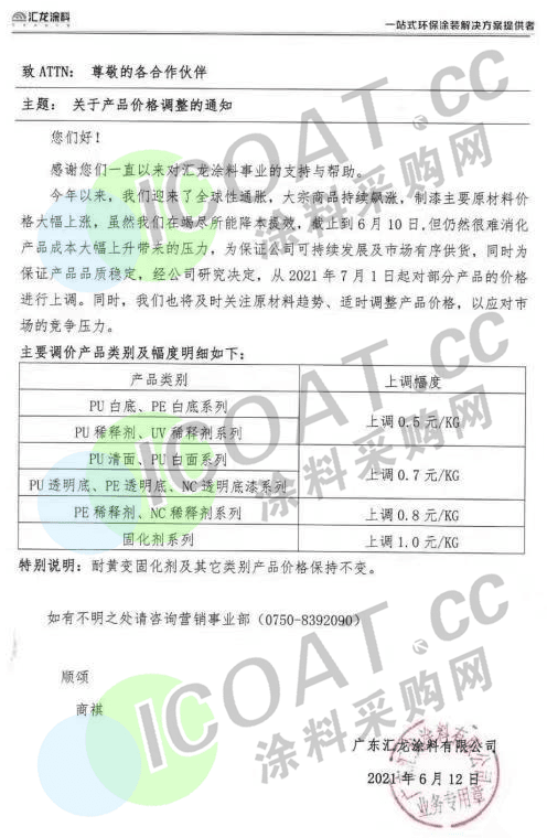匯龍涂料:自2021年7月1日起對部分產品的價格進行上調。其中,PU白底、PE白底、PU稀釋劑、UV稀釋劑系列產品上調0.5元/kg;PU清面、PU白面系列、PU透明底、PE透明底、NC透明底漆系列產品上調0.7元/kg;PE稀釋劑,NC稀釋劑系列產品上調0.8元/kg;固化劑系列產品上調1.0元/kg。