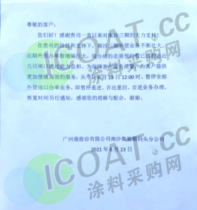 據廣州南沙集裝箱碼頭消息:從6月23日12:00時起,暫停全部外貿出口辦單業務。據悉這是碼頭過渡飽和之后的一個臨時措施,且暫無通知何時恢復,但此前深圳鹽田港的情況顯然更加嚴重。