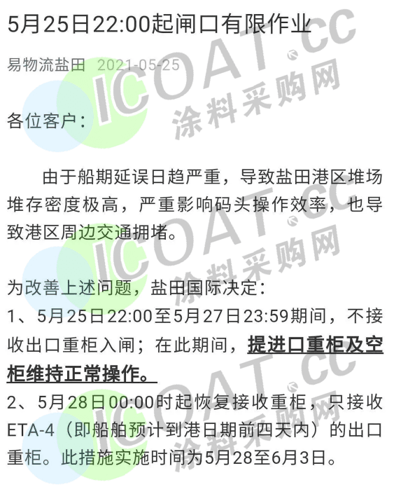 深圳鹽田國際集裝箱碼頭于近日宣布,由于船期延誤日趨嚴重,導致鹽田港區堆場堆存密度極高,嚴重影響碼頭操作效率,也導致港區周邊交通擁堵。為改善上述問題,鹽田國際決定:1、5月25日22:00至5月27日23:59期間,不接收出口重柜入閘;但是,在此期間,提進口重柜及空柜維持正常操作。2、5月28日00:00時起恢復接收重柜,只接收ETA-4(即船舶預計到港日期前四天內)的出口重柜。此措施實施時間為5月28至6月3日。