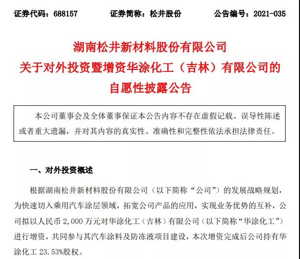 近日,松井股份(或稱“公司”)公布公告,根據公司的發展戰略規劃,為快速切入乘用汽車涂層領域,拓寬公司產品的應用,實現業務優勢的互補,公司擬以人民幣2000萬元對華涂化工(吉林)有限公司(“華涂化工”)進行增資,共同參與其汽車涂料及防凍液項目建設,此次增資完成后公司持有華涂化工23.53%股權。