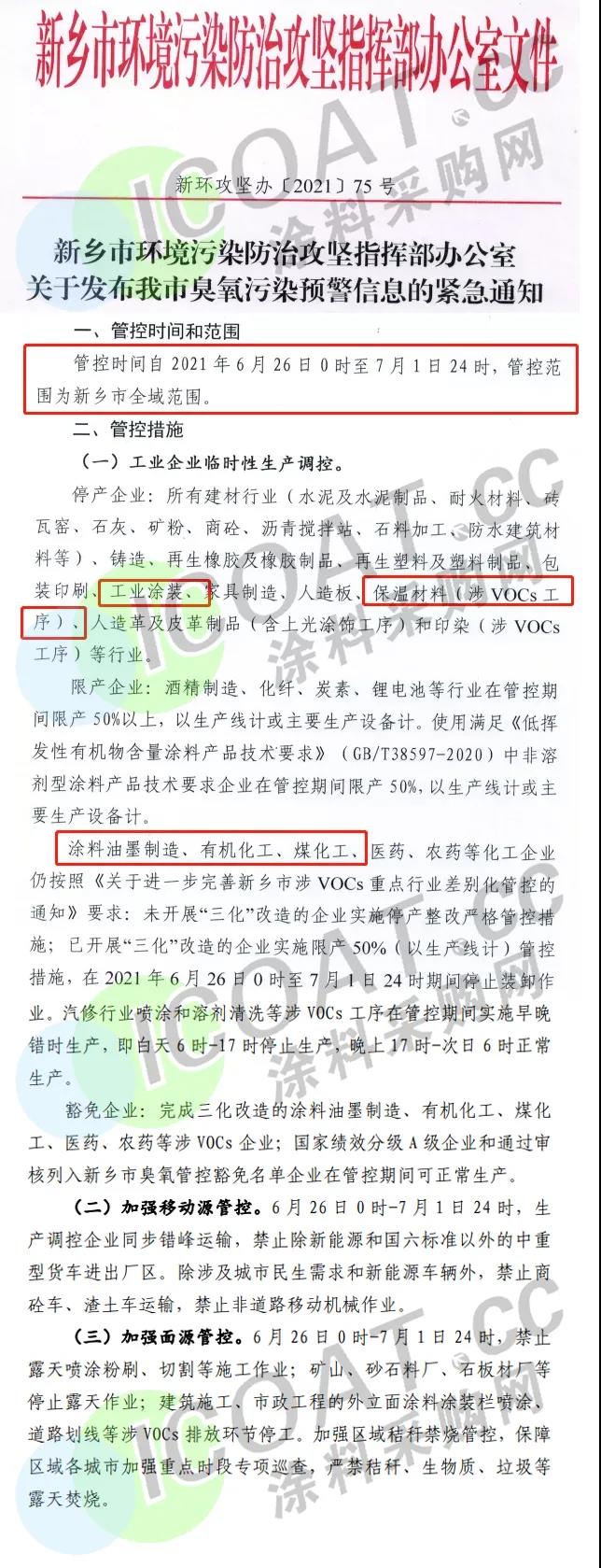 據涂料采購網了解,近日河北、山東、河南等多個省市地區發布通知,為有效改善空氣質量,強化管控措施,對于涂料、化工等行業及部分涉VOCs工序實施停限產措施,同時對于運輸方面也采取了嚴格的管控措施。