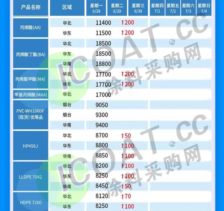 上海華誼丙烯酸最新報價(華東送到)在11000元/噸,較上一交易日相比上漲200元/噸,實際成交價以協商為主。