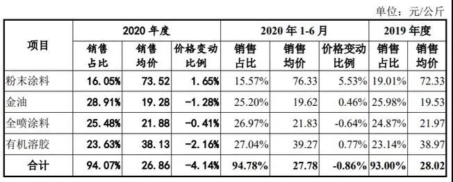 如上表所示,2020年1-6月/2020年度,公司三片罐涂料的銷售價格同比下降的原因為公司三片罐涂料銷售結(jié)構(gòu)有所變化,銷售價格相對偏高的粉末涂料產(chǎn)品銷售占比下降。