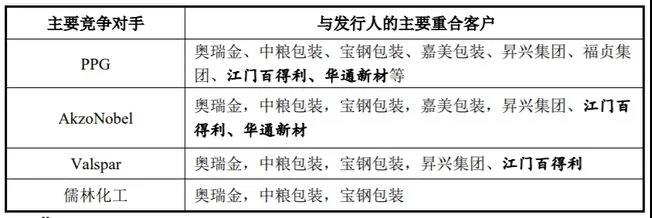 根據(jù)公司銷售部門的了解,公司與食品飲料包裝涂料領(lǐng)域主要競爭對手的主要客戶重合情況如下: