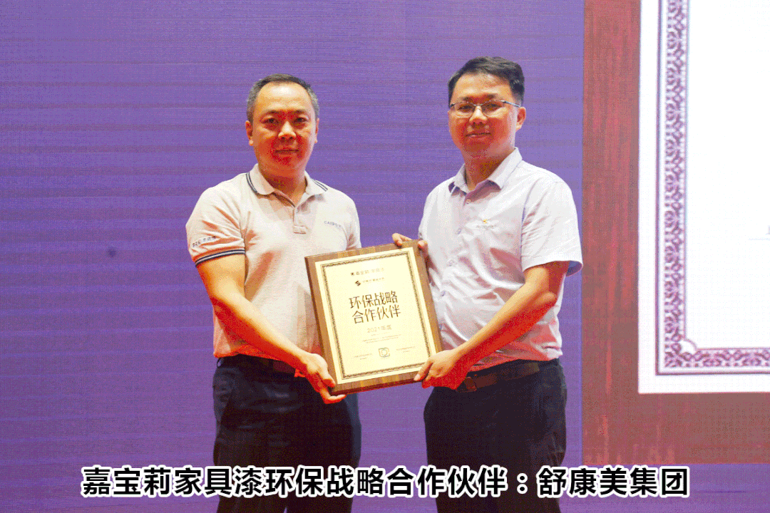 在數(shù)位嘉賓分享完主題內(nèi)容后,又開啟了活動(dòng)的一個(gè)小高潮——嘉寶莉家具漆2021年度“環(huán)保戰(zhàn)略合作伙伴”授牌儀式。