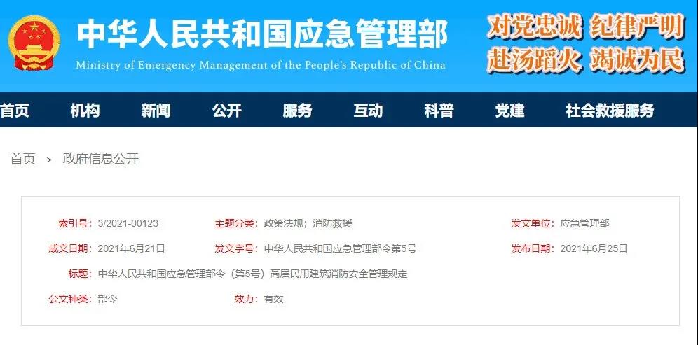 《高層民用建筑消防安全管理規定》已經2020年12月28日應急管理部第39次部務會議審議通過,現予公布,自2021年8月1日起施行。