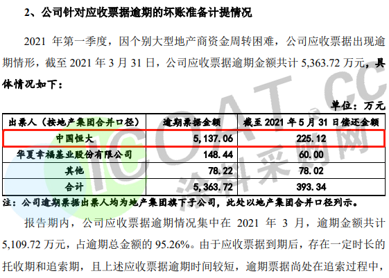 截至2020年12月31日,科順股份應收票據(商業承兌票據)期末余額6.08億元。其中華夏幸福基業股份有限公司(包含關聯公司)應收票據賬面余額為6697萬元,壞賬準備金額為5357萬元,計提理由為華夏幸福因經營不善出現債務危機,報告期對其應收款項按照80%計提壞賬準備。