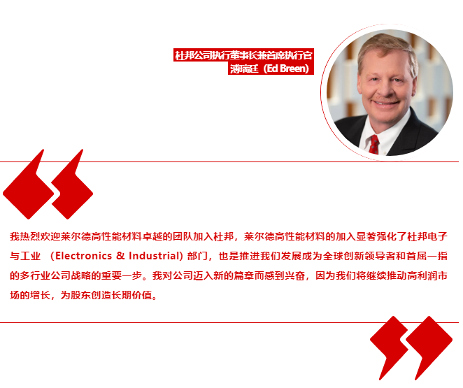 萊爾德高性能材料成為電子與工業事業部電子互連科技業務的一部分,此項收購將加強杜邦公司在快速增長的先進電子應用領域的領先地位,支持高性能計算、人工智能、5G通信、智能/自動駕駛汽車和物聯網等關鍵行業大趨勢。