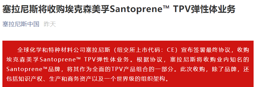 同樣是6月30日,全球領先的高性能工程塑料生產商塞拉尼斯宣布簽署了一份收購埃克森美孚的Santoprene™TPV彈性體業務最終協議。根據協議,塞拉尼斯將收購業界著名的Santoprene™品牌作為其TPV廣泛產品組合的一部分,收購也包括相關的知識產權、生產和商業資產及一個世界級的團隊。
