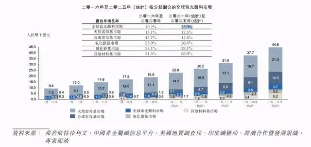 弗若斯特沙利文估計,全球新材料市場規模將于2024年達人民幣32,511.1億元,2020年至2024年年均復合增長率達10.9%。弗若斯特沙利文估計2021-2025環球新材所在的新材料細分賽道在全球及中國的復合年增長率分別為23.9%及30.8%,珠光材料的應用和需求數量都呈現出高速增長的態勢。