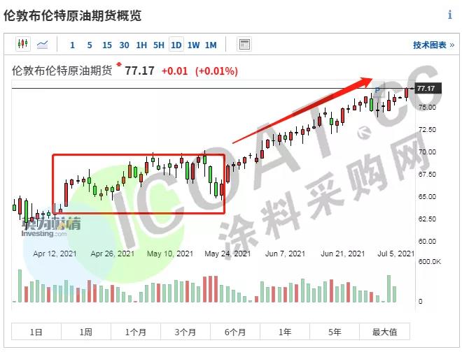 據涂料采購網了解,自去年疫情爆發跌入谷底之后,國際油價直線飆升,近期更是屢創新高。WTI原油從年初的48.48美元上漲至76.21美元,漲幅57.2%;布倫特原油從年初的51.72上漲至77.1美元,漲幅達49.07%。此次OPEC+會議“談崩”,無情打破了大家對于油價下跌的期望。