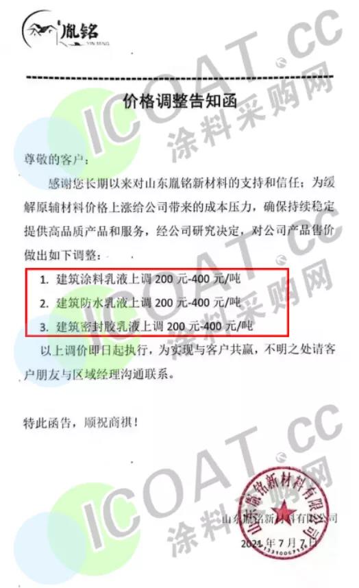 山東胤銘新材料:建筑涂料乳液、建筑防水乳液、建筑密封膠乳液均上調200-400元/噸。
