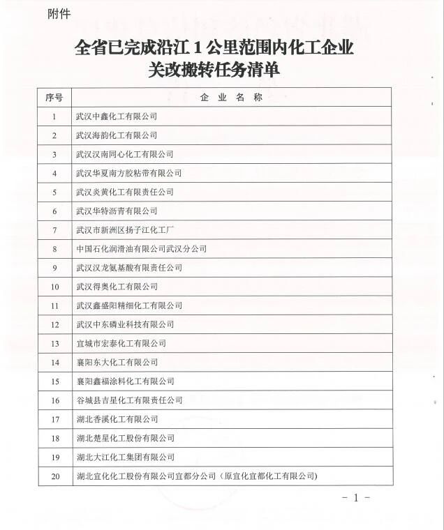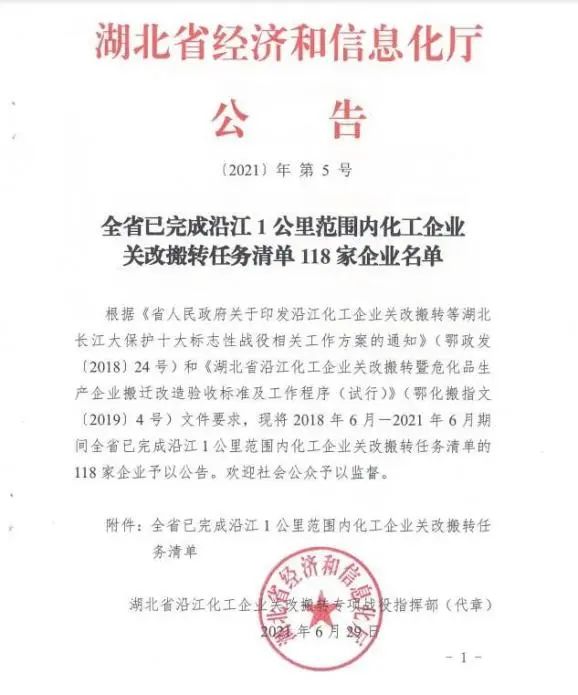湖北省經濟和信息化廳網站發布公告,2018年6月-2021年6月期間全省已完成沿江1公里范圍內化工企業(118家)關改搬轉任務。