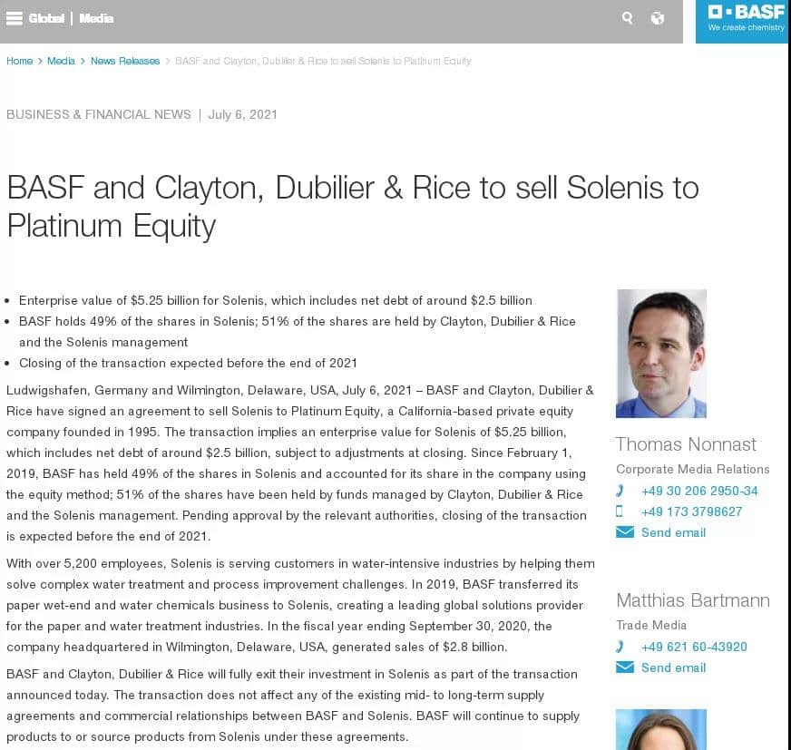 作為交易的一部分,巴斯夫和Clayton, Dubilier & Rice將完全退出對索理思的投資,該交易不影響巴斯夫與索理思之間現有的任何中長期供應協議和商業關系。根據這些協議,巴斯夫將繼續向索理思供應產品或從索理思采購產品。