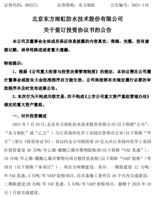 近日,東方雨虹(或稱“公司”)公告,公司擬投資25億元在江蘇揚州化學(xué)工業(yè)園區(qū)投資建設(shè)40萬噸/年乙烯-醋酸乙烯共聚物膠粘劑(簡稱“VAE乳液”)、10萬噸/年乙烯-醋酸乙烯共聚物可再分散性乳膠粉(簡稱“VAEP膠粉”)等項目。此外,公司擬投資5億元在儀征市真州鎮(zhèn)投資建設(shè)東方雨虹儀征綠色建材生產(chǎn)基地項目及研發(fā)基地項目。