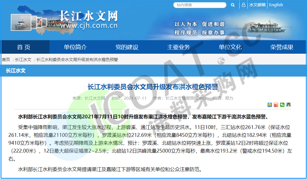 水利部長江水利委員會水文局2021年7月11日10時升級發布渠江洪水橙色預警,發布嘉陵江下游干流洪水藍色預警。另外,據水利部預測分析,今年汛期黃河中游可能發生較大洪水,目前黃河已進入防汛關鍵期。